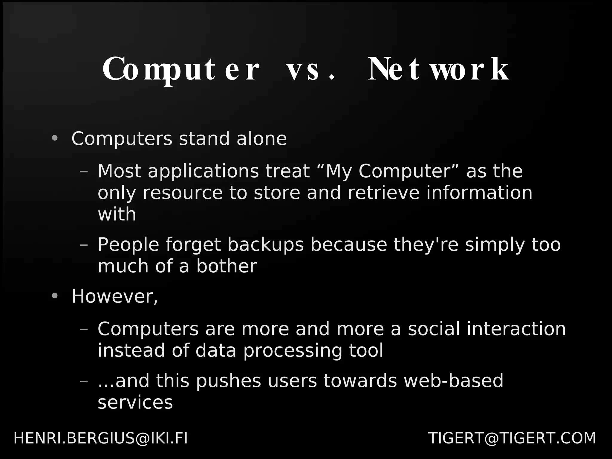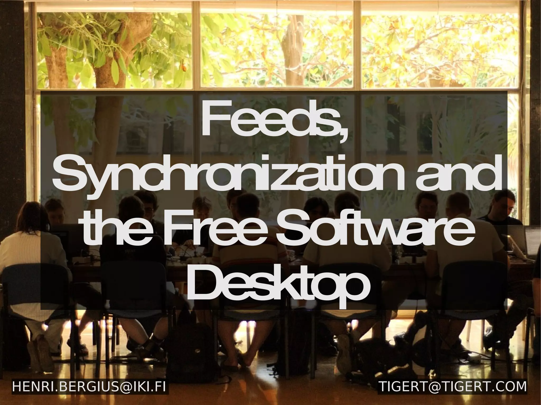 The document discusses the evolution of computers into social interaction tools, emphasizing the need for better synchronization between desktop and web-based applications. It outlines principles for effective synchronization, such as the importance of easy sharing, local copies, and the integration of location-based services. The conclusion highlights the need for cross-project collaboration in free software to improve backup and offline access functionalities.