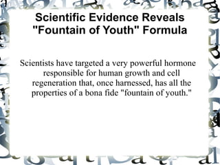 The document discusses the benefits of human growth hormone (HGH) as a potential 'fountain of youth', highlighting its role in cell regeneration and various health improvements such as weight loss, improved memory, and increased skin elasticity. It details the drop in HGH levels with age and presents new treatment options that stimulate the body to produce its own HGH, rather than relying on injections. These advancements aim to enhance overall well-being and combat the effects of aging.
