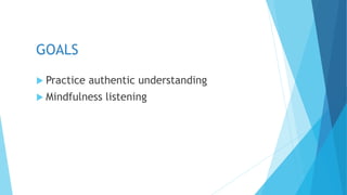 The document outlines a structured session aimed at promoting understanding and mindfulness across political divides. It includes various discussion prompts and activities focused on personal experiences and feelings about political issues, encouraging participants to listen actively and engage empathetically. The session concludes with a reflection on ways to create positive change in one's community amidst polarization.