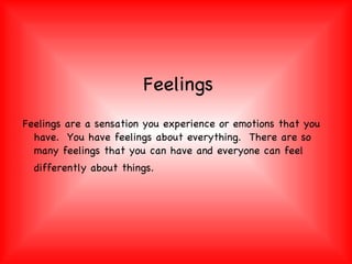 The document discusses feelings and emotions. It defines feelings as sensations or emotions that people experience. It categorizes feelings into good feelings like happy, excited, and amazed, and bad feelings like sad, angry, and worried. The document provides ways to deal with feelings such as talking to friends, exercising, or writing in a diary. It emphasizes the importance of sharing feelings with others rather than keeping them inside. Schools provide counselors, teachers, and principals who can help if one needs support.