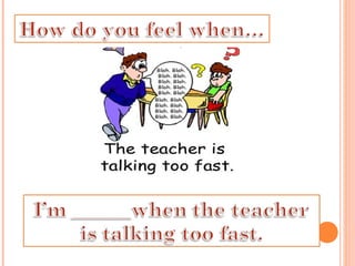 The document discusses feelings and emotions, highlighting their variability and universal presence. It includes dialogues illustrating how to express and inquire about feelings, along with reasons for those emotions and suggestions for improvement. The format is interactive, encouraging conversation and emotional expression in various contexts.