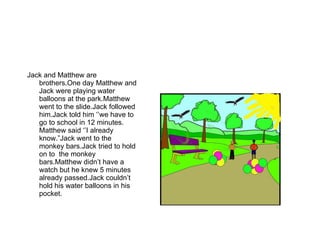 Jack and his brother Matthew were playing with water balloons at the park before school. Matthew noticed the time and reminded Jack that they needed to leave for school soon. They ran to catch the bus just in time. When Matthew realized he had forgotten his book bag, another teacher brought it to the classroom for him.
