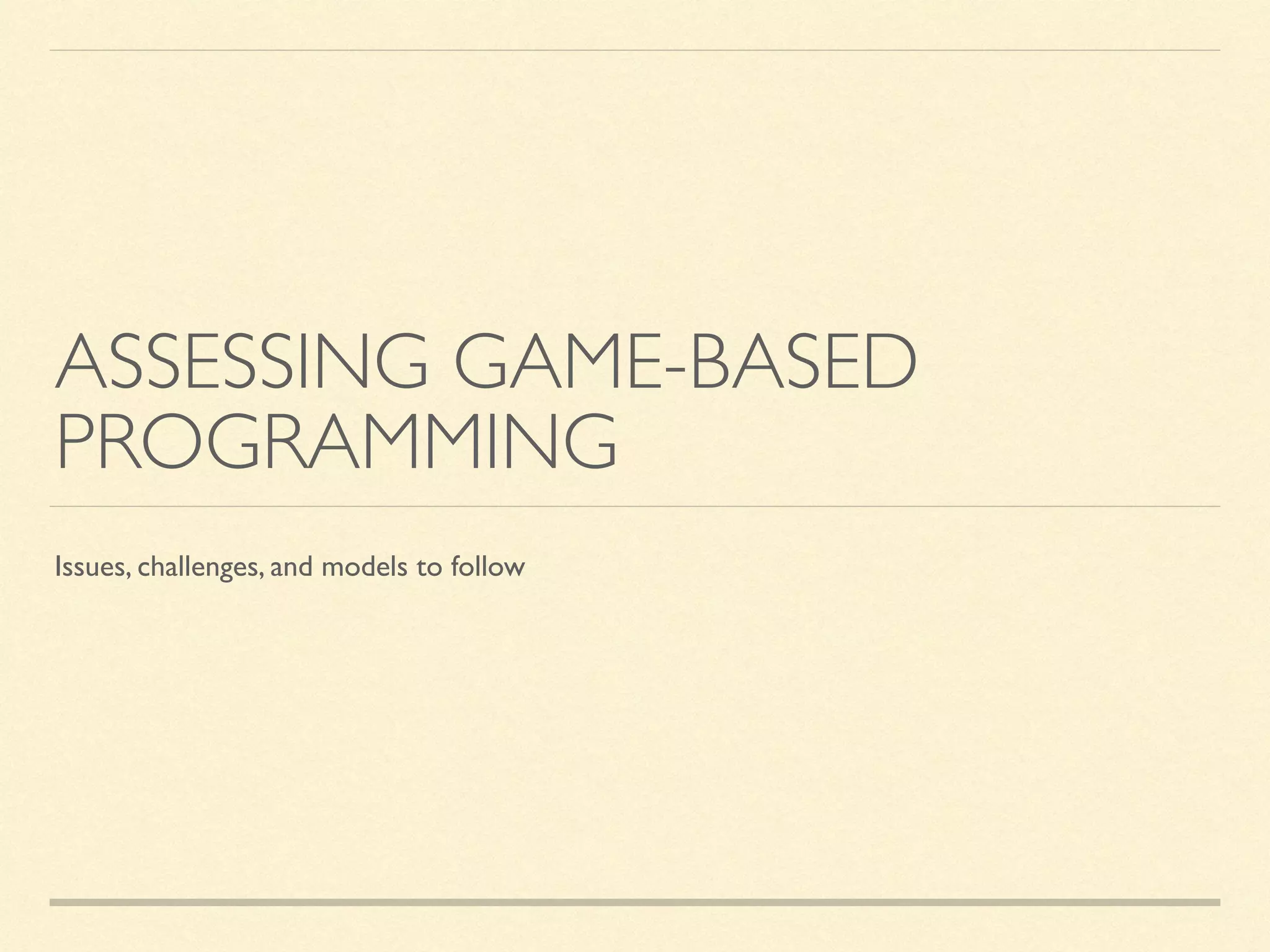 The document explores the integration of game-based assessment in libraries, focusing on the LibraryQuest program aimed at enhancing students' engagement and learning. It outlines key principles for effective assessment design, including setting measurable goals, aligning with institutional objectives, and involving others in the process. The program seeks to improve incoming freshmen's confidence and skills in using library resources through interactive quests while considering challenges like game complexity and privacy concerns.