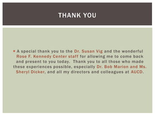 The document provides an overview of AUCD (Association of University Centers on Disabilities) and the Disability Policy Fellowship program. It discusses AUCD's history and mission of advancing policy for people with disabilities. It describes the goals and responsibilities of the fellowship, including assisting with legislation and attending advocacy events. Past fellows' accomplishments working on issues like healthcare reform and education are also summarized.