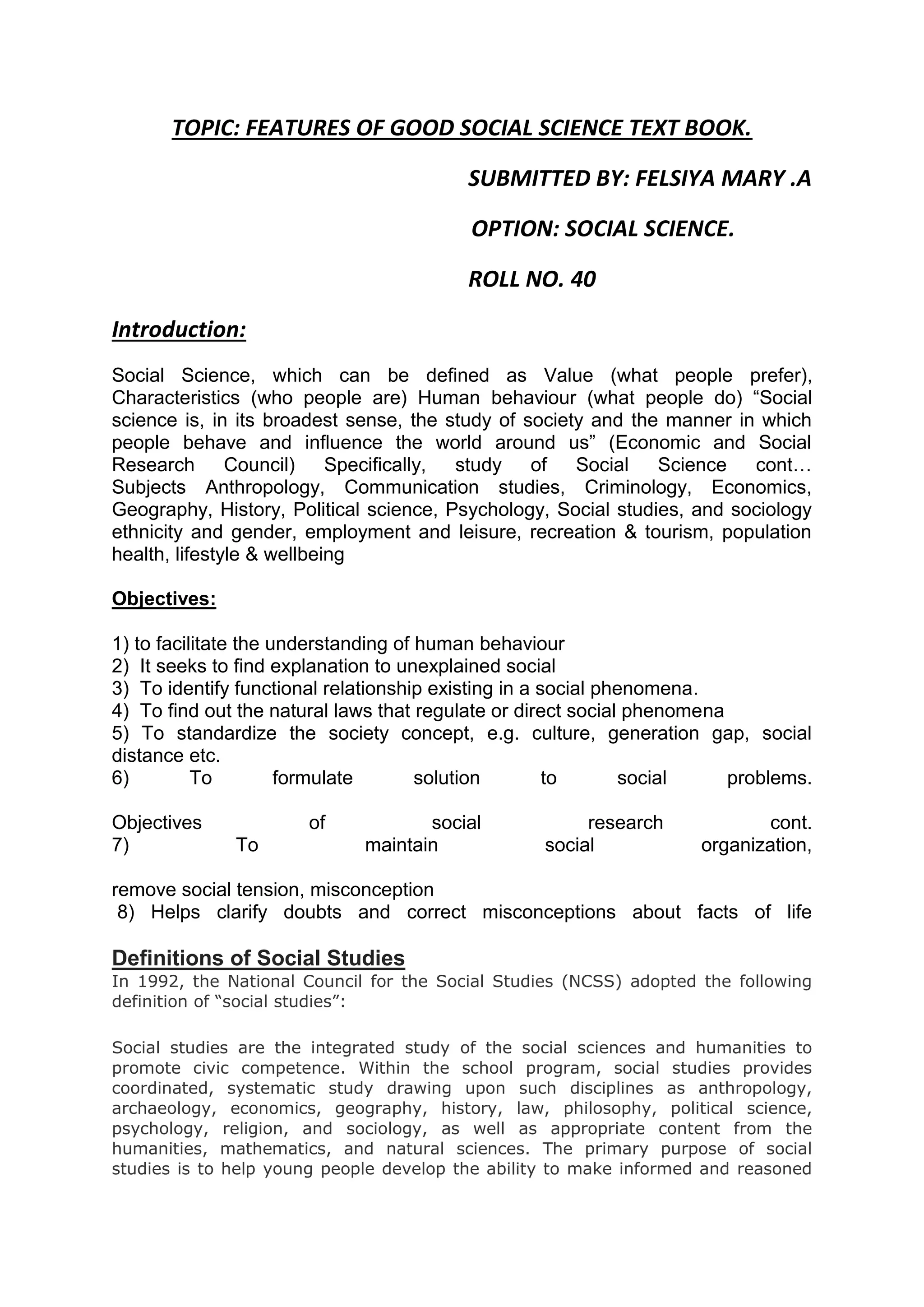 1) The document discusses the key features and criteria for a good social science textbook. It should facilitate understanding of human behavior, identify relationships in social phenomena, and formulate solutions to social problems.