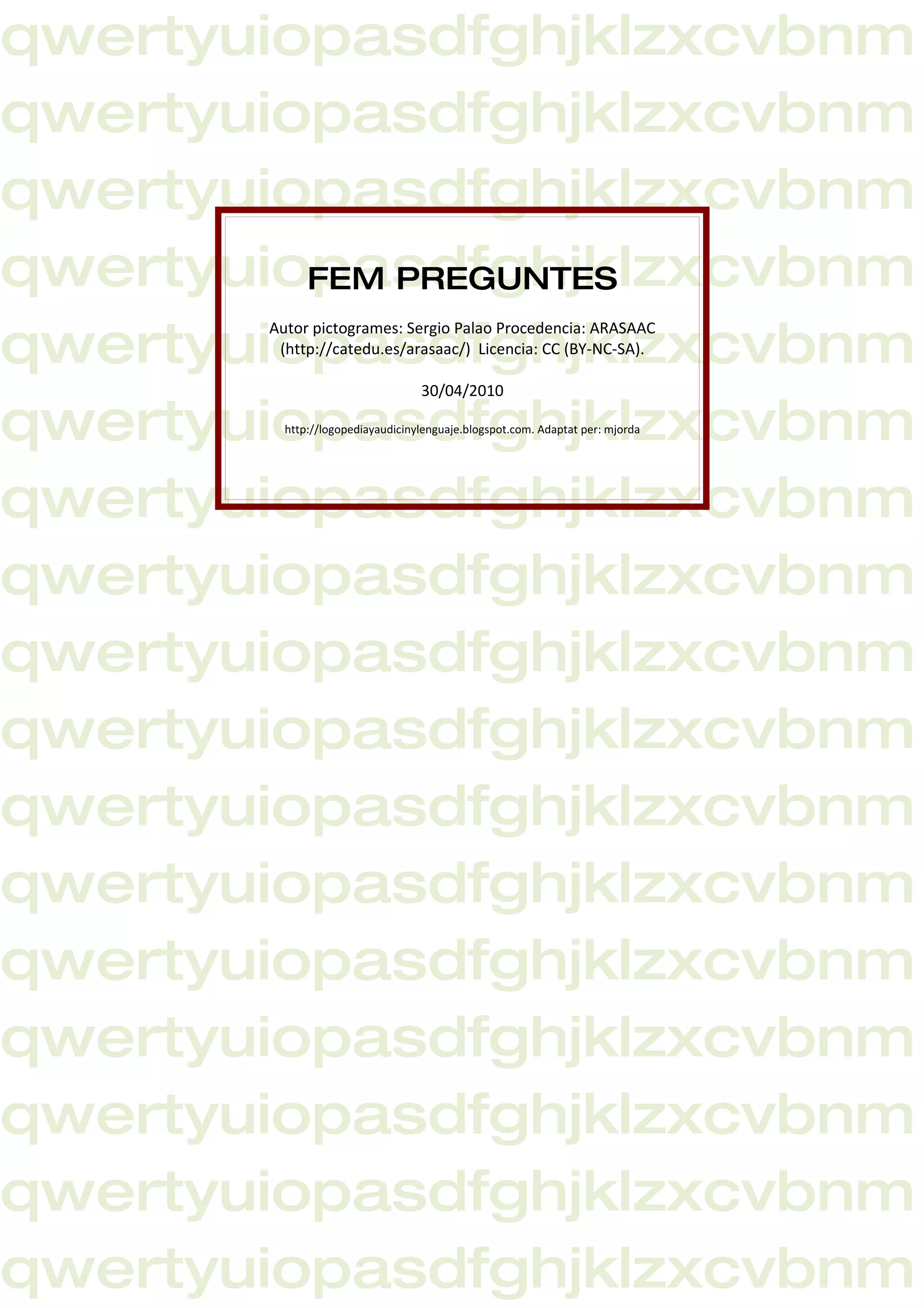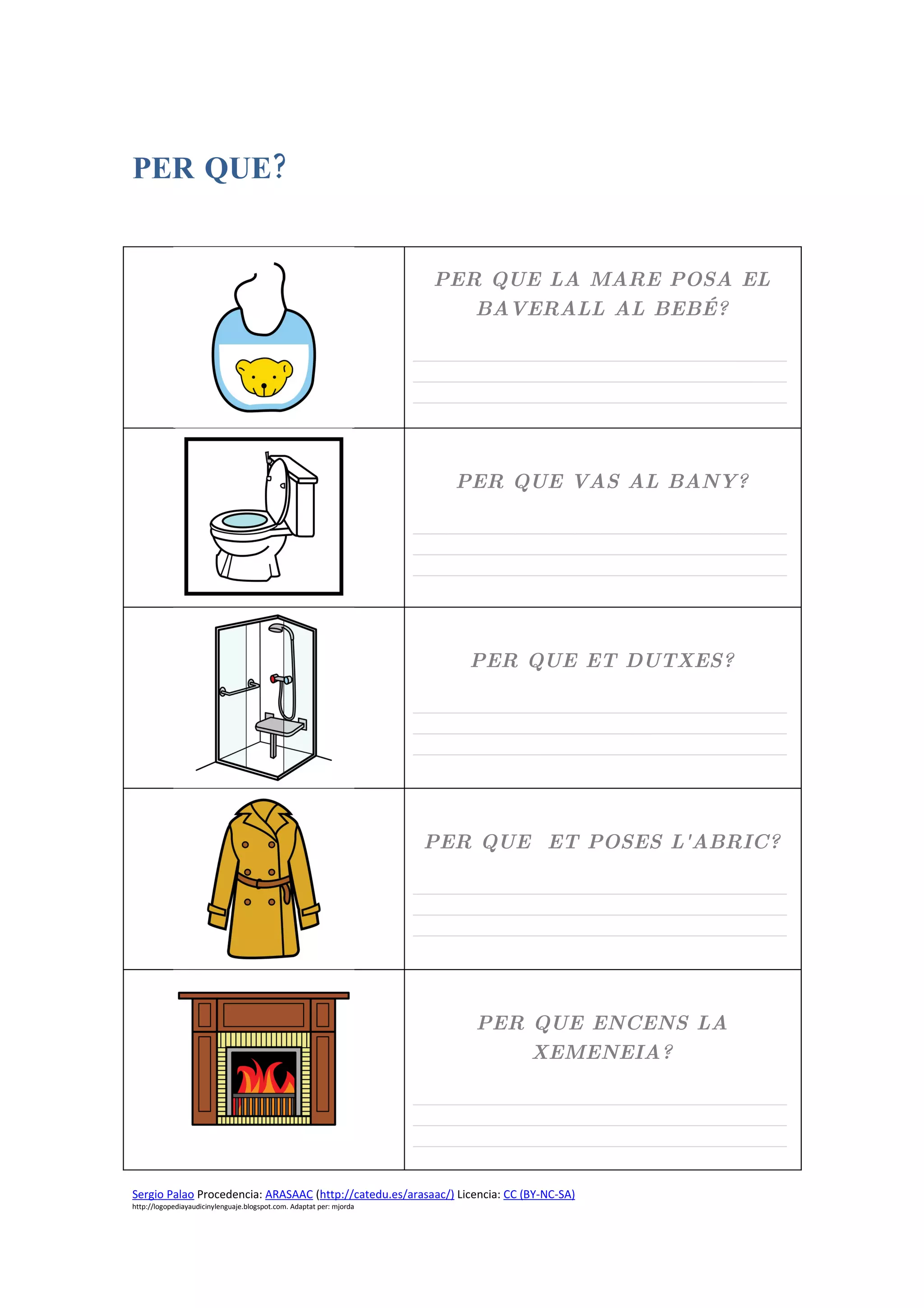 The document appears to be a collection of pictograms in Catalan with questions beginning with "Per que" (meaning "Why" in English). Each pictogram shows an image related to a common activity, situation, or object and includes 3 blank lines for writing potential reasons or explanations in Catalan. Information is provided about the creator and source for adapting the pictograms.
