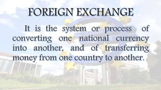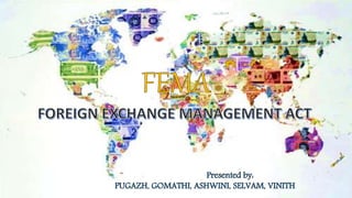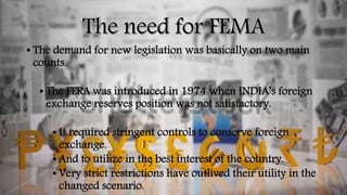 The document discusses India's foreign exchange market and the regulations governing it. The Reserve Bank of India regulates the market under the Foreign Exchange Management Act of 1999 (FEMA), which replaced the older Foreign Exchange Regulation Act (FERA). FEMA aims to make offenses civil rather than criminal and simplifies regulations. Authorized dealers like exporters, importers, corporations, and non-residents participate in the market. FEMA's objectives include facilitating trade and payments, maintaining an orderly exchange market, and regulating foreign capital and payments in India.