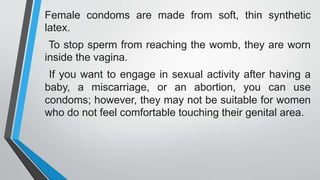 Female condoms are made of thin, soft synthetic latex and worn inside the vagina during sex to prevent sperm from reaching the egg. They function as an intravaginal barrier by preventing contact between sperm and the egg. To use one, insert it into the vagina before sex and ensure the penis is placed inside the condom, not between it and the vaginal wall. Female condoms are 95% effective against pregnancy when used correctly and offer protection from STIs, but can be less effective if the penis touches the vaginal area before insertion, the condom is pushed too far inside, or is damaged during use.