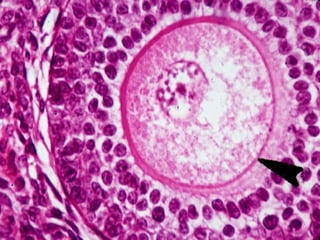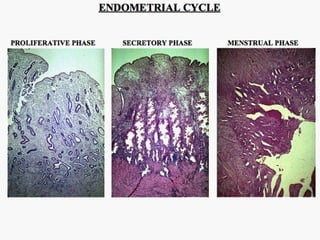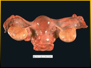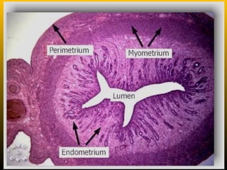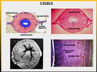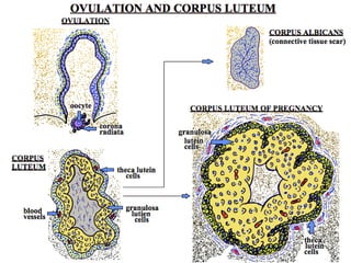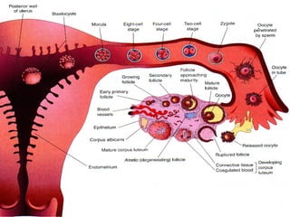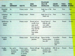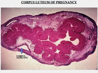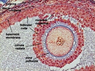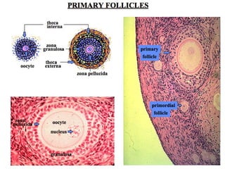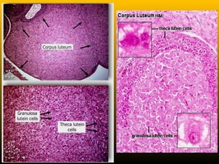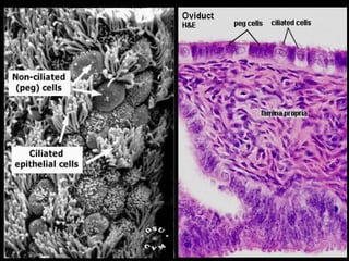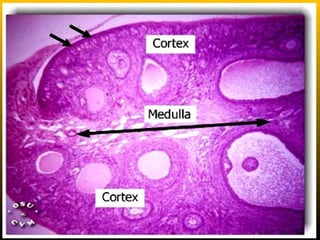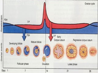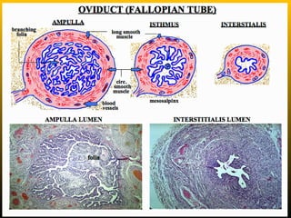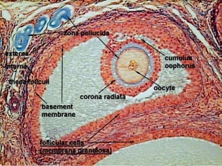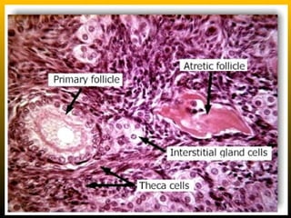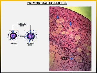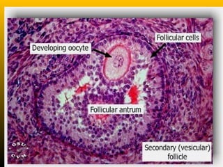 The document describes the key parts of the female reproductive system including internal organs like the ovaries, oviducts, uterus, and vagina as well as external genitalia. It provides details on the ovaries and ovarian follicles, discussing their development from primordial to secondary to graafian follicles. It explains ovulation, the formation and role of the corpus luteum, and the ovarian and hormonal cycles. Key points are summarized around follicular development and atresia, ovulation, the corpus luteum, and the oviduct's role in transporting the ovum and embryo.