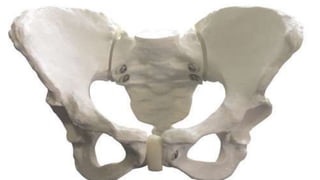 The female pelvis is comprised of four bones - the two innominate bones, sacrum, and coccyx. It has several diameters and landmarks that are important for childbirth. The pelvis can be divided into the false pelvis, pelvic inlet, cavity, and outlet. The inlet is defined by the symphysis pubis, sacral promontory, and iliac bones. Its diameters include the true conjugate, obstetric conjugate, and transverse. The cavity and outlet also have anteroposterior and transverse diameters that are measured. Knowledge of the bones, diameters, and landmarks of the female pelvis is essential for midwives during labor and delivery.