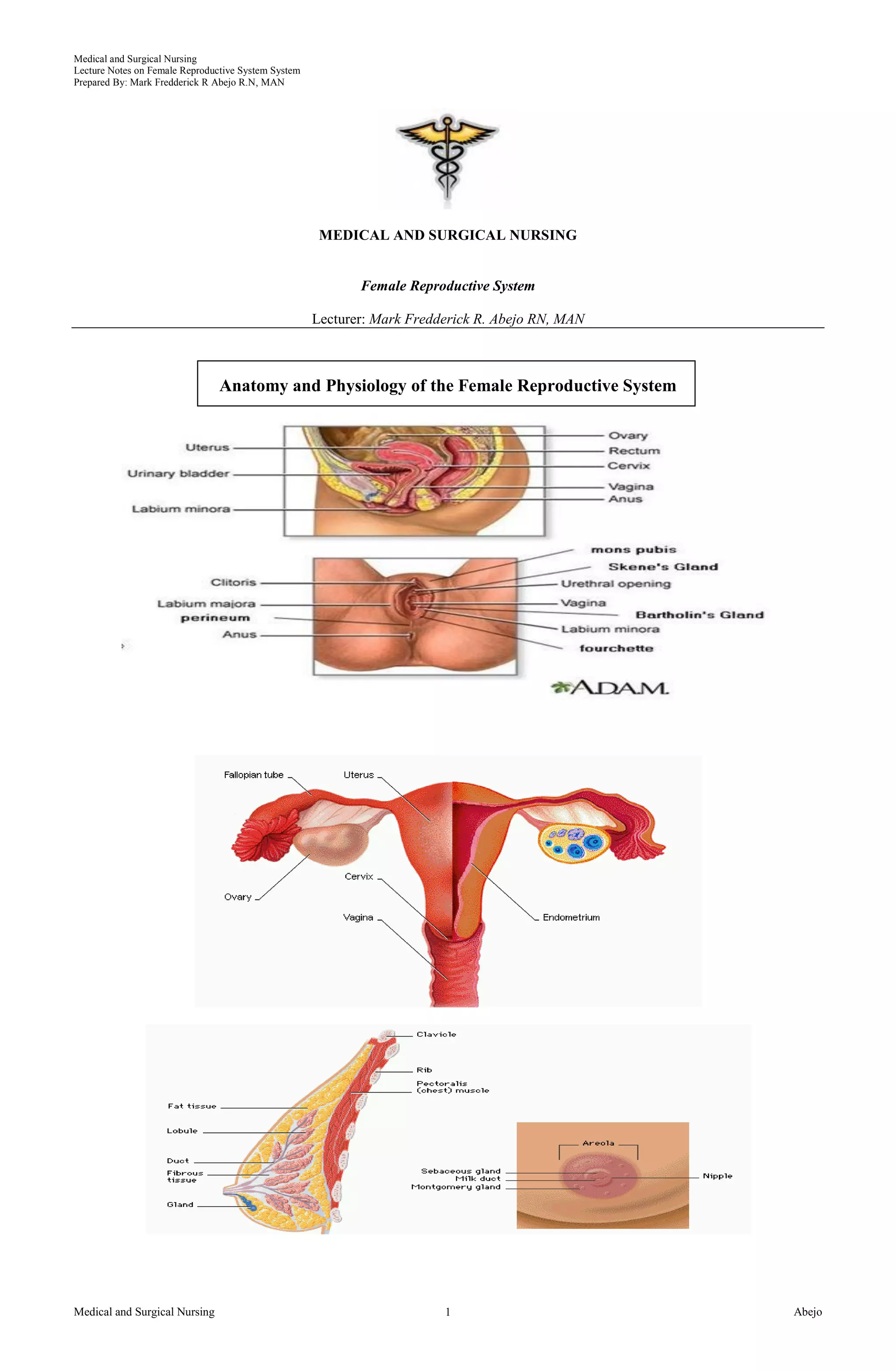 This document provides notes on the female reproductive system prepared by Mark Fredderick R. Abejo. It describes the internal and external female reproductive organs including the vagina, cervix, uterus, fallopian tubes, ovaries, vulva, and clitoris. It also discusses common female reproductive disorders such as ovarian cysts, endometriosis, and uterine fibroids/leiomyomas. The causes, risk factors, clinical manifestations, diagnostic tests, and collaborative management of each condition are described.