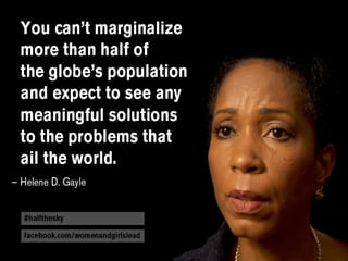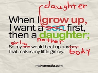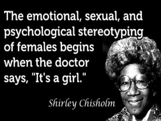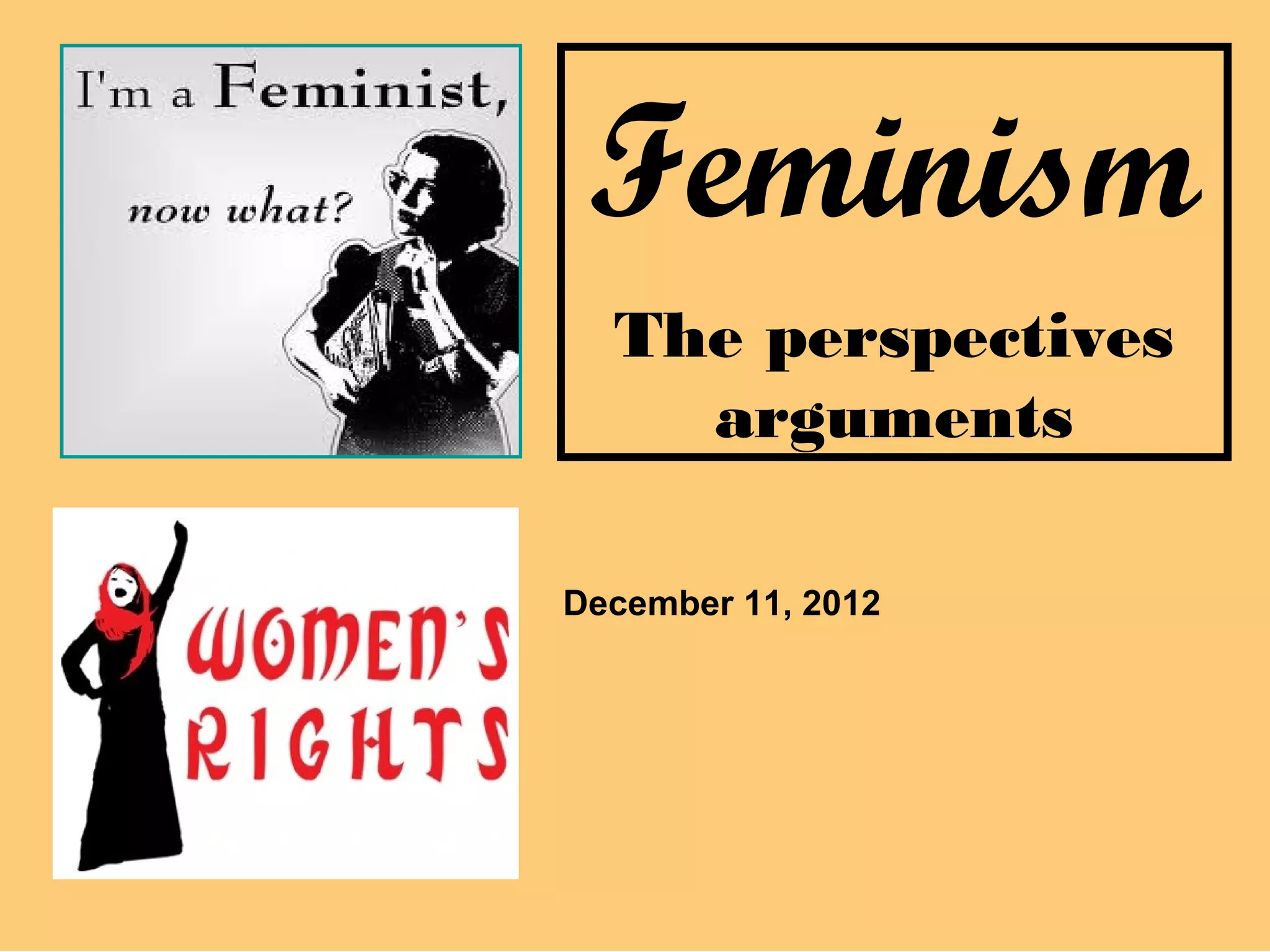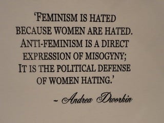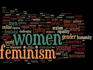 Feminism is a collection of movements and ideologies aimed at defining and establishing equal political, economic, and social rights for women. It has occurred in three waves, focusing on women's suffrage, gender equality, and continued issues of oppression, respectively. Feminism explores the interconnected nature of concepts like patriarchy, sexism, and women's status globally that contribute to women's inequality. It aims to challenge these systems through perspectives like liberal, radical, socialist, and postcolonial feminism.