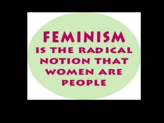 The document provides an overview of feminism, including its definitions and historical development across three waves. Key figures such as Abigail Adams and Gloria Steinem are highlighted, as well as the evolution of feminist thought, from early suffrage movements to modern-day issues like ecofeminism and black feminism. It discusses various feminist ideologies, including liberal, radical, socialist, and third-wave feminism, each emphasizing different approaches to achieving gender equality.