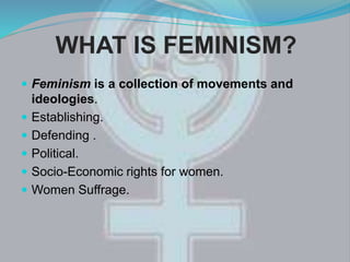 This document discusses the history and key concepts of feminism. It defines feminism as movements and ideologies that work to establish political, socio-economic, and reproductive rights for women. The document outlines three waves of feminism: first-wave feminism in the 19th-20th centuries focused on women's suffrage and property rights, second-wave feminism in the 1960s focused on issues like education and career opportunities, and third-wave feminism addresses issues like government representation and gender violence. It also discusses feminist theory, different feminist movements and ideologies, and notable feminists from Pakistan who have advocated for women's rights.