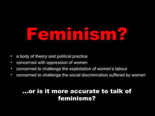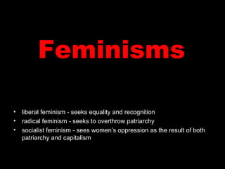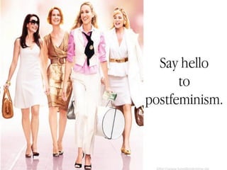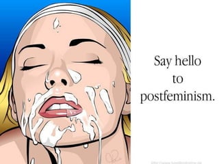 This document discusses several concepts related to feminism and the portrayal of women in popular culture and media. It addresses different types of feminism like liberal feminism, radical feminism, and socialist feminism. It also discusses how popular culture and media often symbolically annihilate women by excluding them, trivializing them, and condemning them. This socializes women into adopting restrictive gender roles like domestic labor and being sex objects. The document also examines how ideological messages in popular culture can train men and women into traditional gender roles.