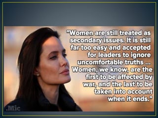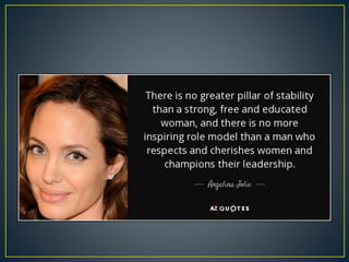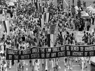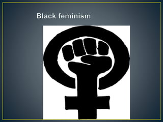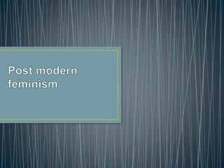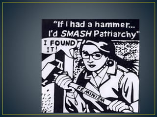 The document provides an overview of the history and key aspects of feminism. It discusses feminism as comprising social, cultural, and political movements for gender equality and women's rights. It outlines the three waves of western feminist movements - first wave in the late 19th century focused on suffrage, second wave from the 1960s-1980s on legal and social rights, and third wave from the 1980s-2000s on representation of women in government. Key figures and ideas that shaped each wave are also mentioned such as Simone de Beauvoir's The Second Sex influencing second wave feminism.
