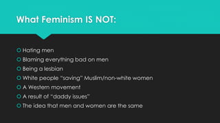 This document discusses feminism and provides definitions of key terms. It explains that feminism seeks to end sexism and oppression of women. Different types of feminism are outlined, including liberal feminism, radical feminism, intersectional feminism, and postcolonial feminism. Islamic feminism is discussed as seeking rights and justice for women through an Islamic framework by questioning patriarchal interpretations of Islamic teachings. The document emphasizes that feminism takes many forms and that women experience oppression differently based on various factors.