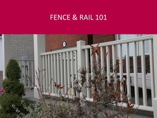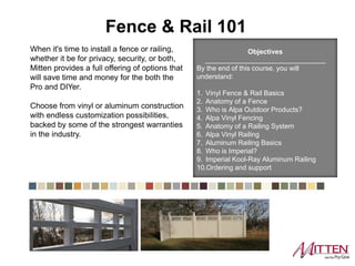 The document outlines an introductory course for vinyl and aluminum fence and railing installation, highlighting Ply Gem's offerings that provide time and cost savings for professionals and DIYers. It details the anatomy of fences and railings, the advantages of vinyl and aluminum materials, and introduces Alpa Outdoor Products and Imperial Manufacturing Group as key manufacturers. Additionally, the course emphasizes customization options, low maintenance features, and includes warranty information for the products discussed.
