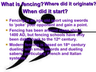 Fencing is a sport that originated in the 14th century involving combat with swords. It is based on 18th century dueling techniques using foils, epees, and sabres. There are various reasons people fence, including for exercise, competition, learning sword skills, and fun. Fencing matches take place on a 14 meter long piste, with points scored by touching the opponent with the sword on target areas. Matches consist of 3 minute bouts or until one player scores 15 points.