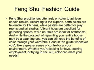 The document provides a Feng Shui fashion guide with recommendations for which colors to wear based on one's intentions. It associates different colors with meanings and effects, such as red drawing attention, orange promoting harmony, and yellow providing clarity. It advises wearing colors like green for growth, blue for communication, and purple for spirituality. The guide cautions that some colors like yellow can be draining and others like white can promote anxiety. It suggests metallic colors for creative projects but warns they make people critical.