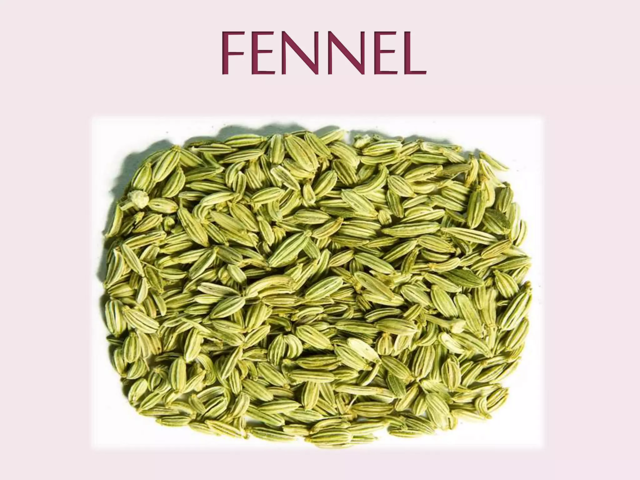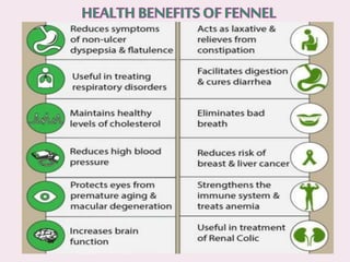 This document summarizes information about fennel (Foeniculum vulgare). It states that fennel is a hardy, aromatic herb indigenous to the Mediterranean region but now grown worldwide. India is a top producer of fennel seeds, which are used as a carminative, stimulant, and mouth freshener. The document provides details on fennel cultivation methods, including best climates, soil types, seed sowing and harvesting procedures, and average yields. It also outlines uses of fennel seeds and oil in foods, medicines, and cosmetics.