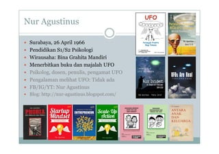 Dokumen tersebut merangkum biografi singkat Nur Agustinus sebagai psikolog, dosen, penulis dan pengamat fenomena UFO. Dokumen ini juga membahas berbagai topik yang berkaitan dengan UFO seperti penampakan, bentuk, teknologi, konspirasi serta perspektif ilmiah dan spiritual mengenai UFO.