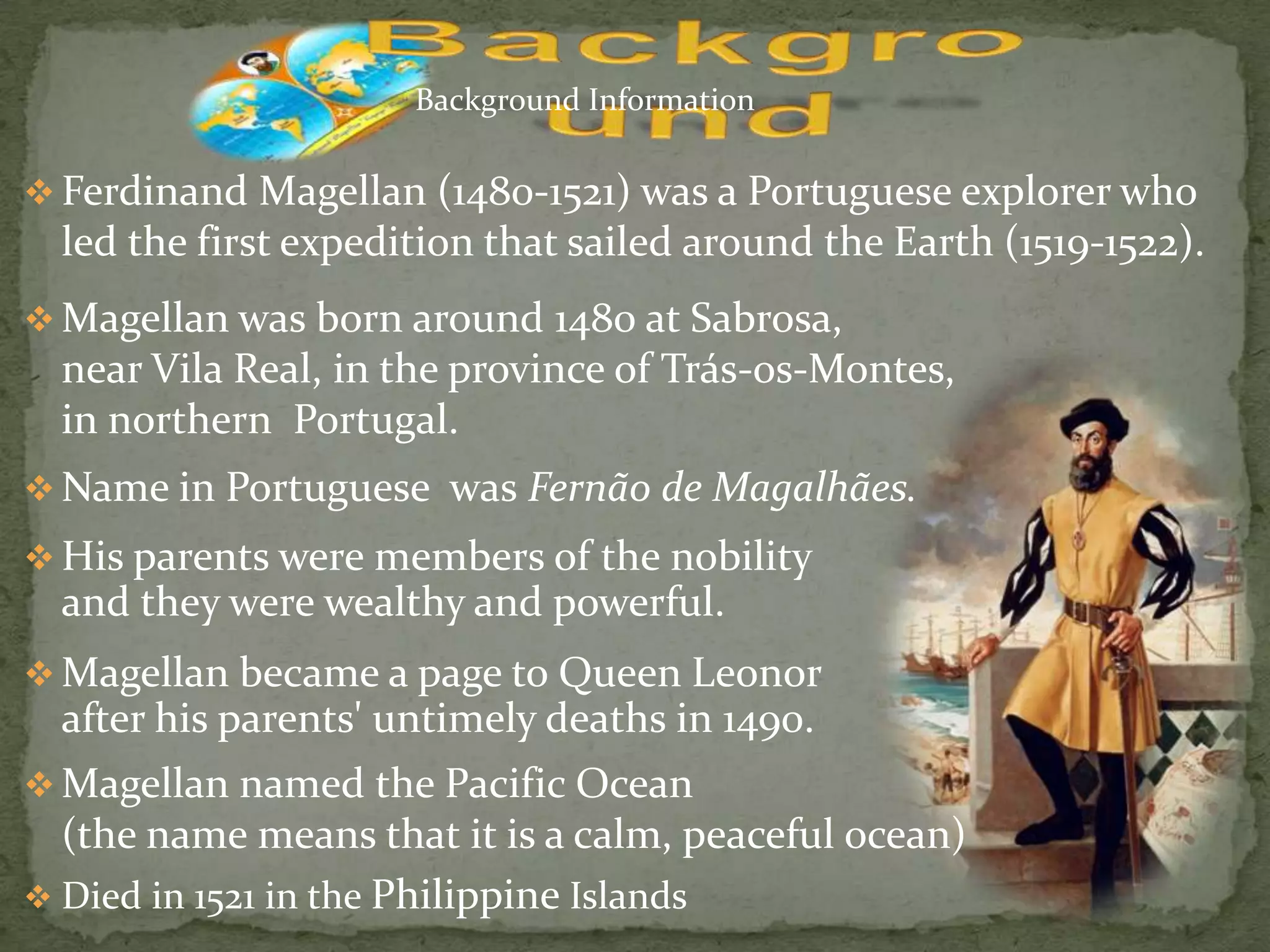 Ferdinand Magellan was a Portuguese explorer who led the first expedition to circumnavigate the globe from 1519-1522. Representing Spain, Magellan sailed from Spain with 240 men in 5 ships in September 1519. After finding the passage between the Atlantic and Pacific oceans now known as the Strait of Magellan, Magellan reached the Philippines where he was killed in 1521. Only 18 of the original crew survived the journey, proving that it was possible to sail from Spain to Asia by traveling around South America and across the Pacific Ocean.