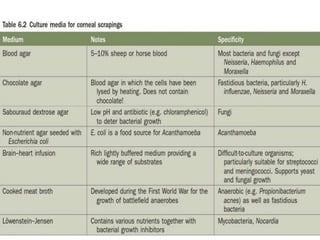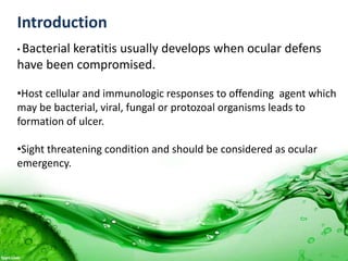 Bacterial keratitis is a sight-threatening condition that develops when the eye's defenses are compromised. It is caused by bacteria such as Pseudomonas, Staphylococcus, and Streptococcus invading the cornea. Risk factors include trauma, ocular surface diseases, contact lens wear, and immunosuppression. Treatment involves local and systemic antibiotics based on smear and culture results, along with cycloplegics and analgesics. For impending perforation, measures to lower pressure and tissue adhesives may be used. Surgery is needed for large perforations or non-healing ulcers.