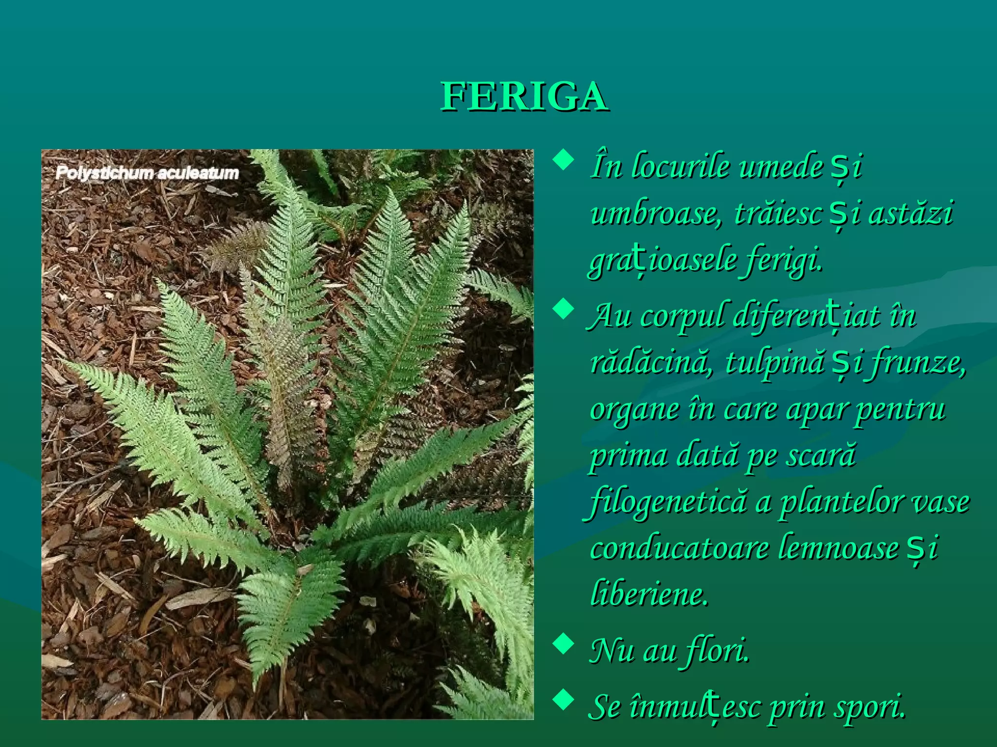 Ferigile cresc în locuri umede și umbroase, având un corp diferențiat format din rădăcină, tulpină și frunze, dar nu produc flori. Ele se reproduc prin spori, care se formează în sporangi localizate pe partea ventrală a frunzelor, iar sporii germină pe sol umed formând un protal. De acolo, organele reproducătoare se dezvoltă și se combină pentru a da naștere unei noi ferigi.