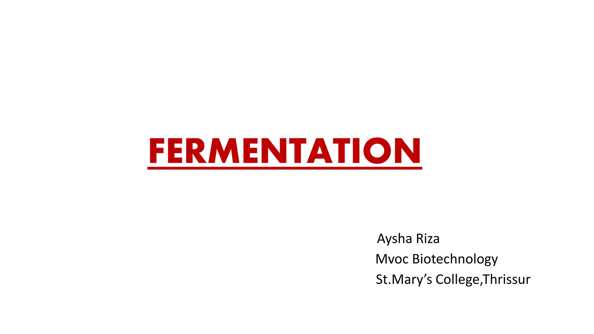 The document discusses fermentation as a metabolic process that converts carbohydrates into acids or alcohols, primarily under anaerobic conditions. It outlines two main types: lactic acid fermentation, occurring in low oxygen environments, and alcoholic fermentation, carried out by yeast. Key processes, products, and examples of fermented foods are also highlighted.