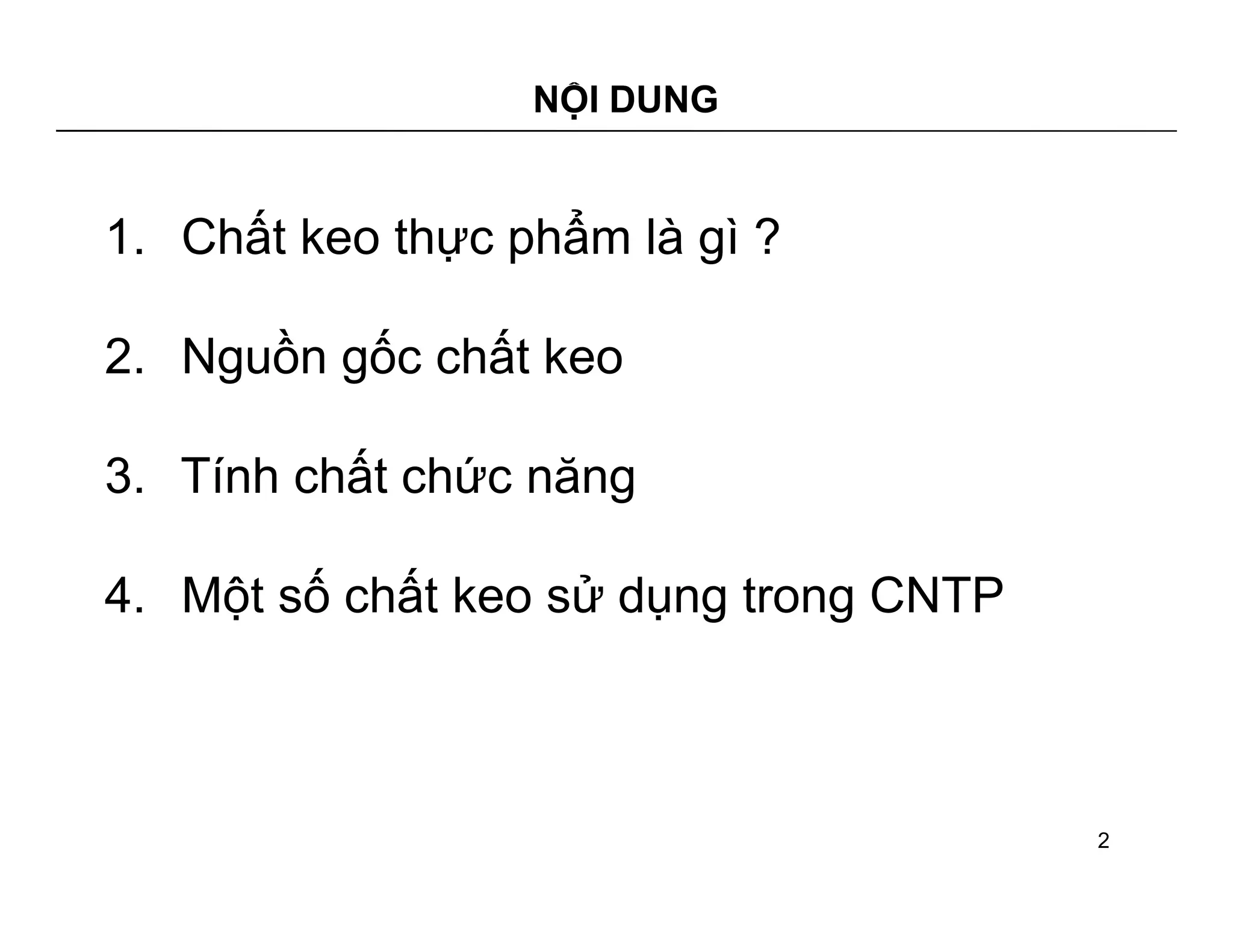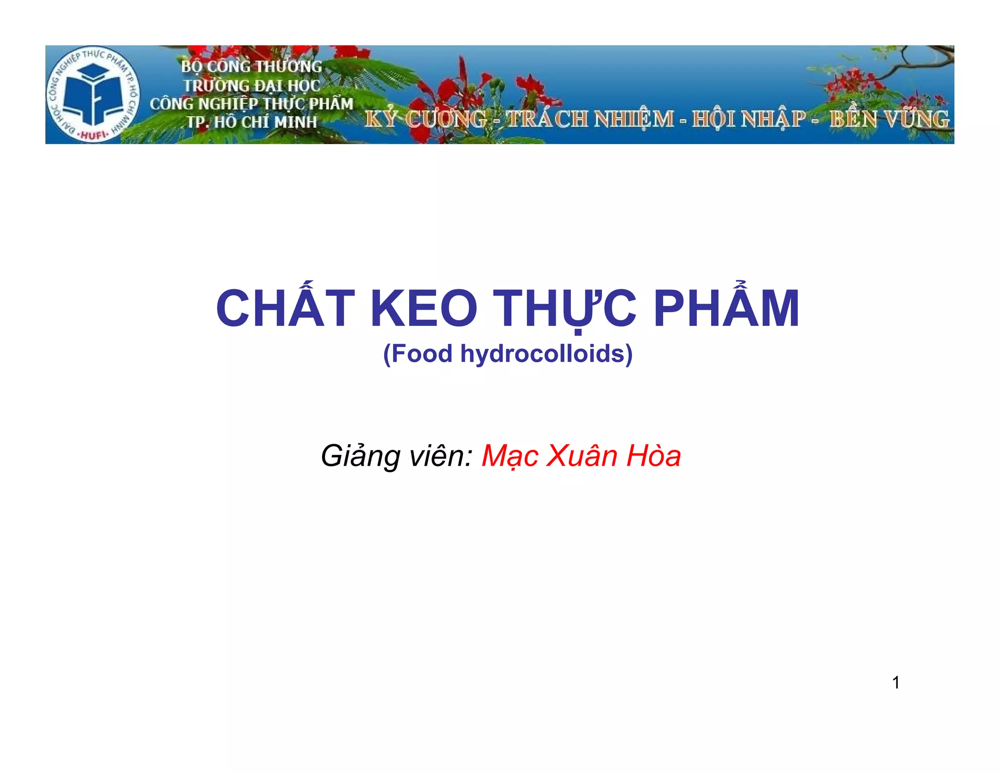 Chất keo thực phẩm là polymer tan trong nước tạo dung dịch keo có tính nhớt. Tài liệu đề cập nguồn gốc, tính chất và chức năng của các chất keo như gelatin, pectin, alginate và starch, cùng với ứng dụng của chúng trong ngành công nghiệp thực phẩm. Các đặc tính như độ nhớt, khả năng tạo gel và khả năng kết hợp được phân tích để phục vụ cho việc ứng dụng trong chế biến thực phẩm.