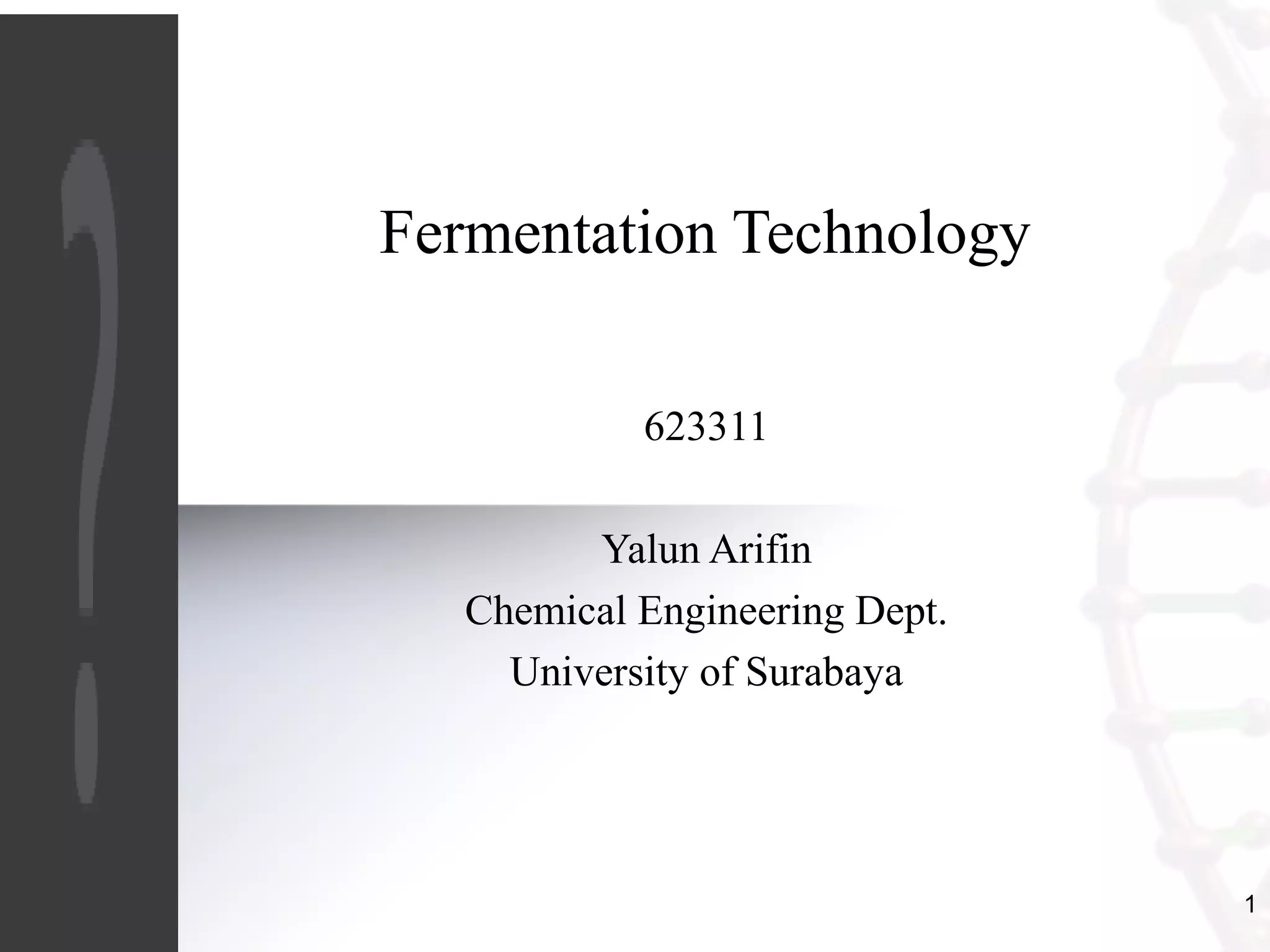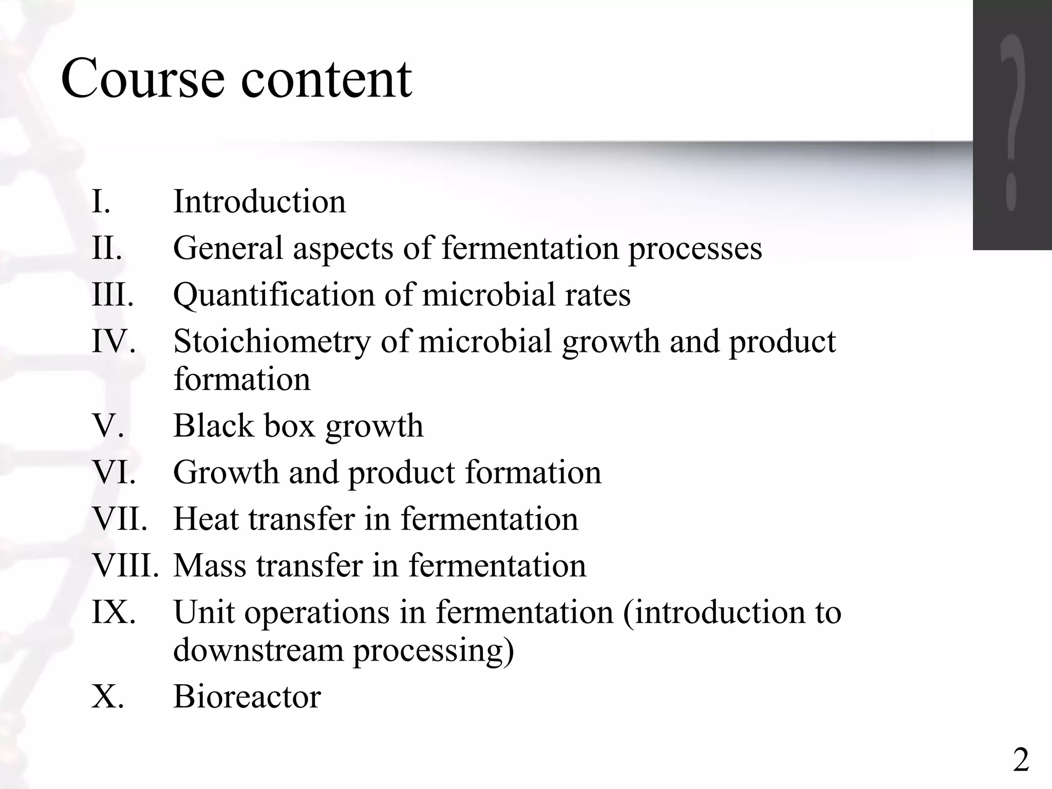 Fermentation is a form of metabolism where microorganisms break down organic compounds without oxygen. This document outlines the key topics in fermentation technology including: fermentation processes, microbial rates, stoichiometry of microbial growth and product formation, and important fermentation products. It also provides examples of stoichiometric calculations for microbial growth including determining yields, degrees of reduction, and setting up general stoichiometric equations using conservation principles.