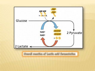 Fermentation is the conversion of carbohydrates into alcohols, carbon dioxide, or organic acids by microorganisms like yeast and bacteria in anaerobic conditions. It results in less energy production than aerobic respiration. Key steps include glycolysis which converts glucose to pyruvate, and alcoholic fermentation which converts pyruvate to ethanol and carbon dioxide. Fermentation is used to produce foods and beverages like beer, wine, yogurt and cheese, as well as treat wastewater.