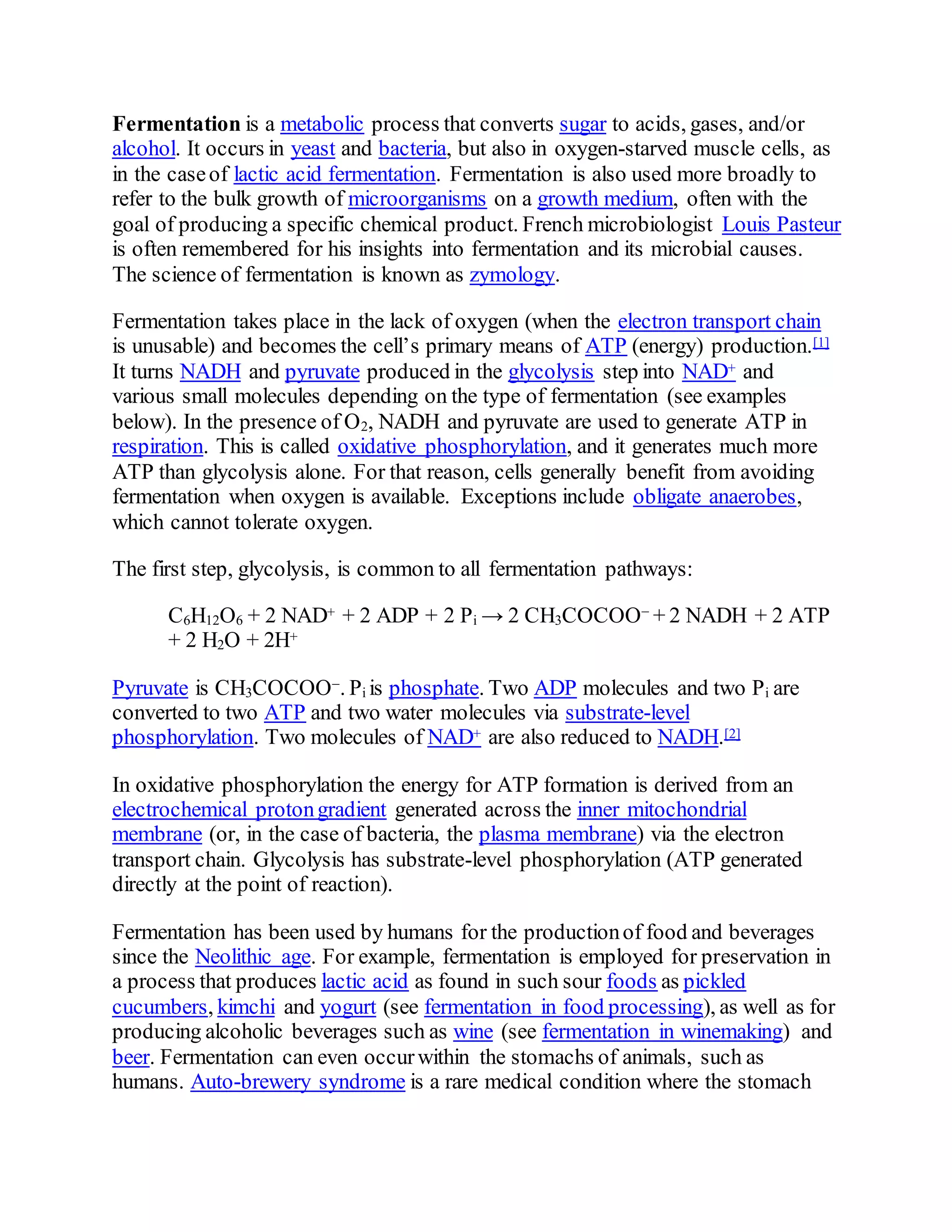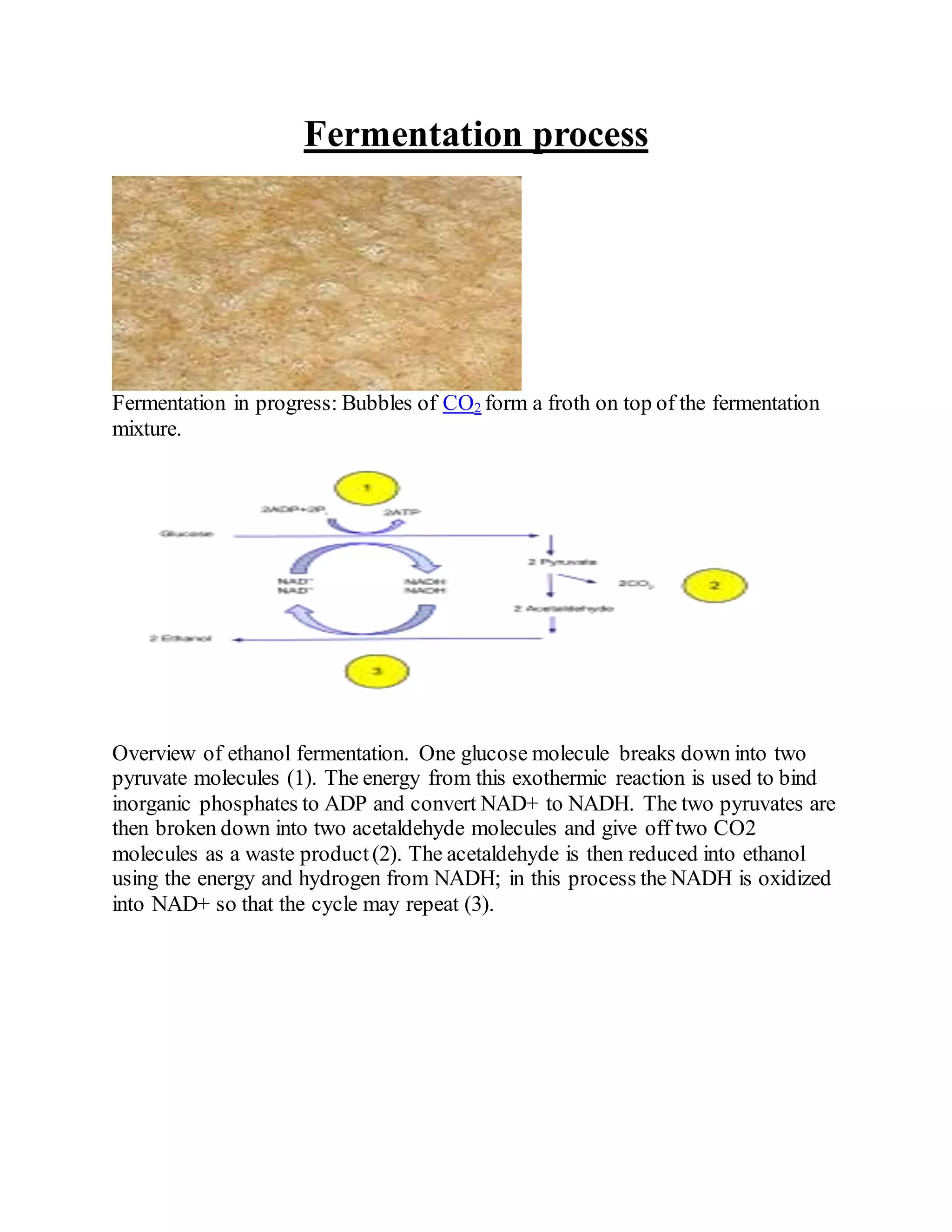 Fermentation is a metabolic process where sugars are converted into acids, gases or alcohol without the use of oxygen. Key points: