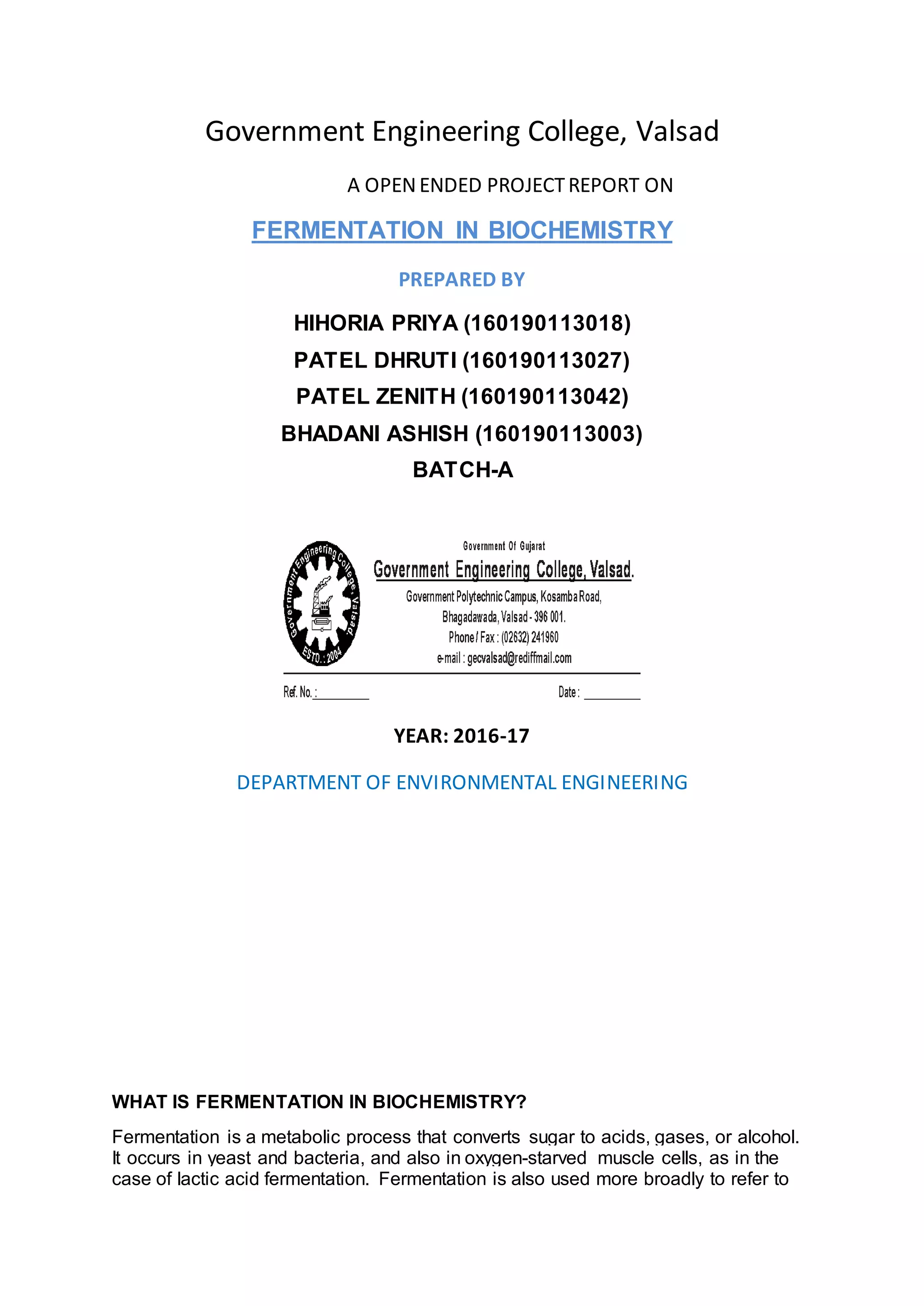 The document presents a project report on fermentation in biochemistry conducted by students from a government engineering college, detailing the fermentation process, its historical context, and its applications in food. It outlines the importance of fermentation for dietary enrichment and preservation, provides examples of fermented foods, and describes an experiment to measure fermentation rates in various fruit juices. The results indicate that different fruit juices ferment at varying rates, with lemon juice showing the highest rate of fermentation.