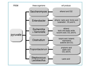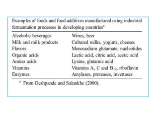 Fermentation is a process where microorganisms are grown on an industrial scale to produce commercial products through metabolic processes. Important fermentation products include ethanol, glycerol, lactic acid, acetone, butanol, and enzymes. Fermentations can occur via submerged or solid-state processes and are carried out using equipment like fermentors. The three main types of fermentation processes are batch, continuous, and fed-batch. Fermentation has advantages like food preservation and production of health and industrial products, though it also has disadvantages like potential microbial contamination issues.