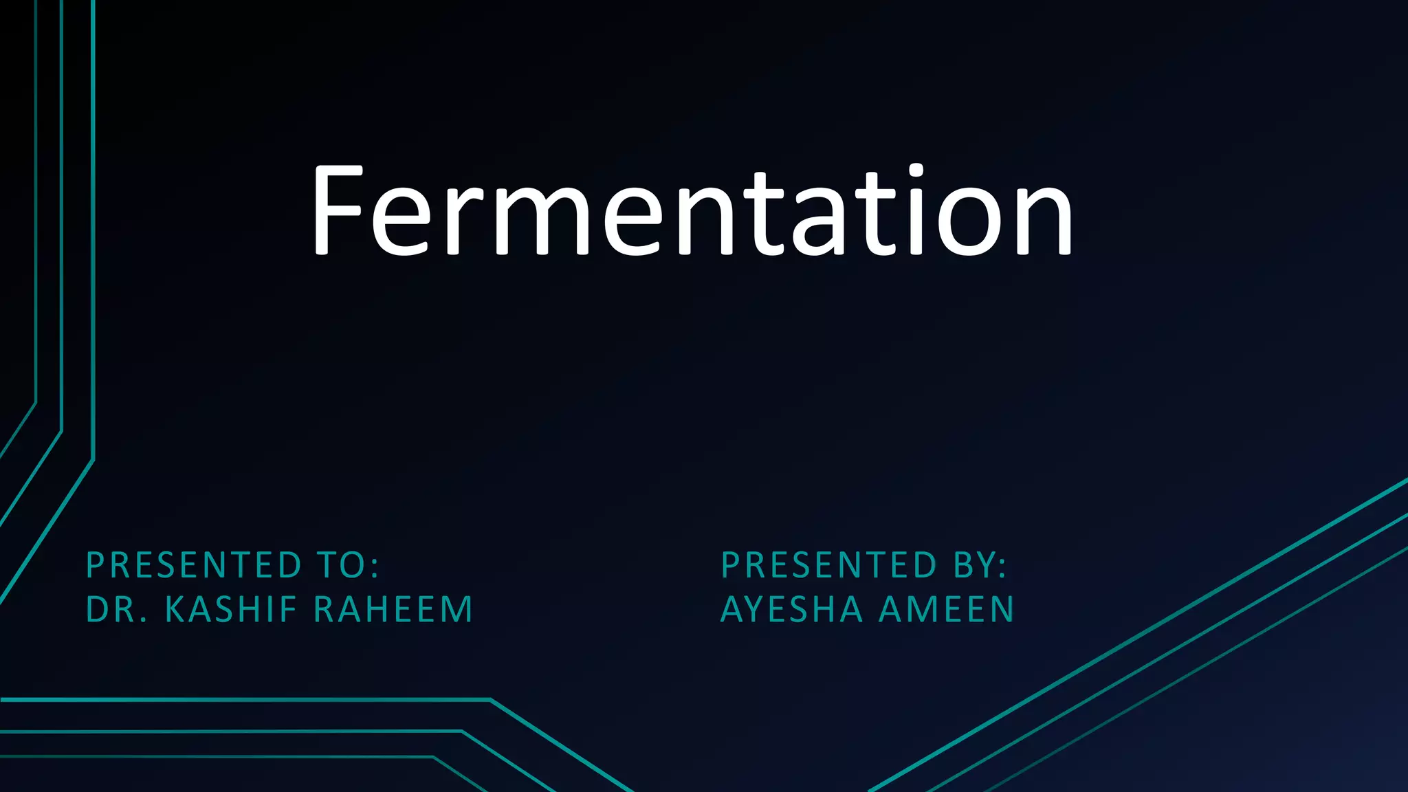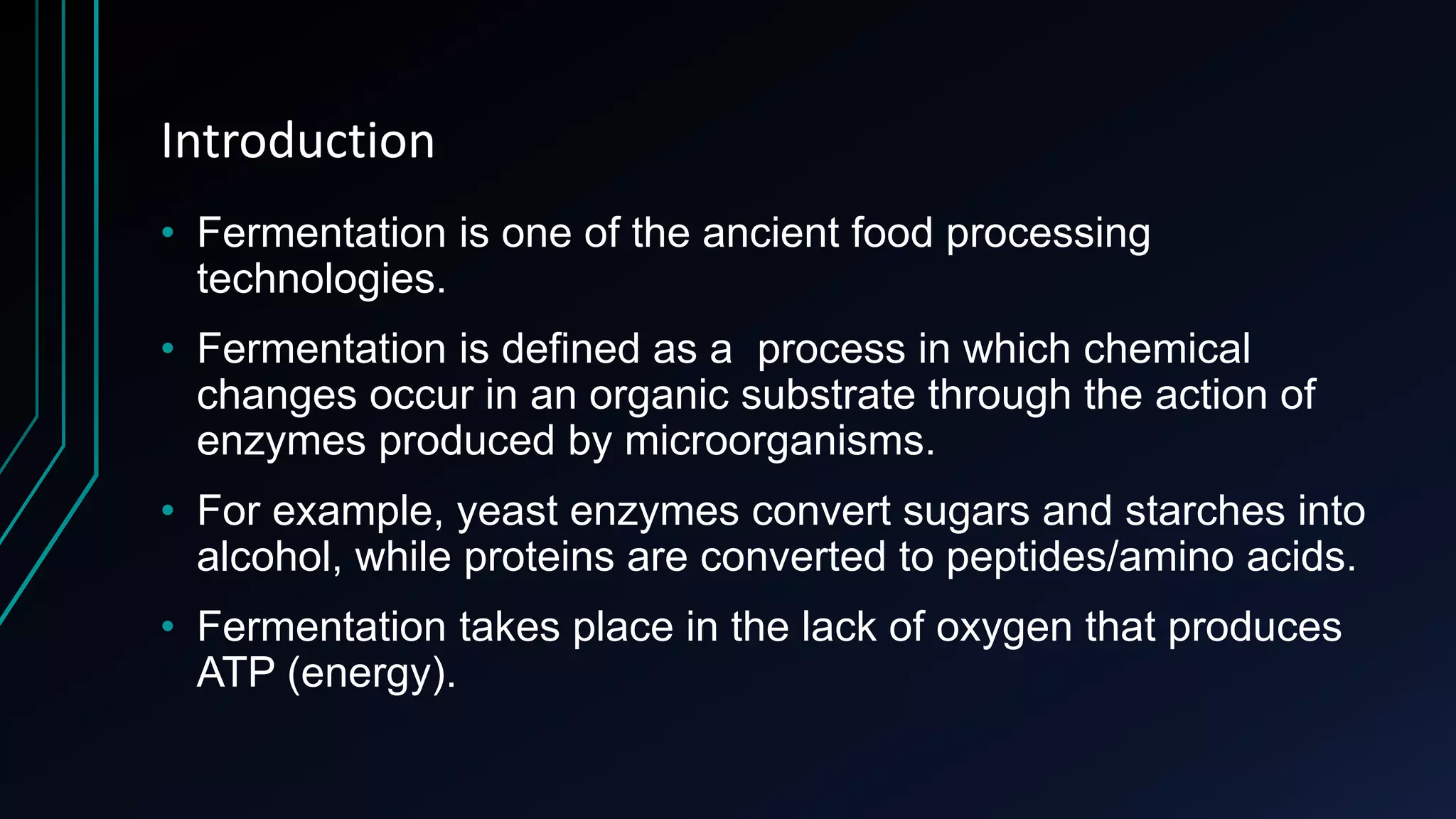 Fermentation is a process where microorganisms convert sugars and starches into other substances in the absence of oxygen. There are several types of fermentation including lactic acid, propionic acid, alcoholic, and butyric acid fermentation. Fermentation has many applications in food production like cheese, wine, and bread. It is also used in medicine to produce antibiotics and vaccines. While fermentation has benefits, it also has limitations like low scale production requiring high costs, risk of contamination, natural variations over time, and production of undesirable end products.