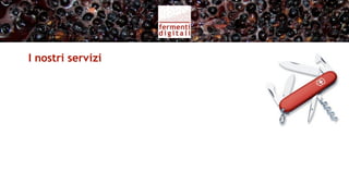 Il documento presenta 'Fermenti Digitali', un marchio creato da Elisabetta Tosi e Giampiero Nadali per aiutare le aziende vinicole a sfruttare le opportunità offerte da internet e a disintermediare le vendite. La missione è supportare le aziende nella vendita diretta attraverso nuovi canali, migliorando la loro presenza online e la relazione con i consumatori. I servizi offerti includono branding, marketing, monitoraggio dei social media e sviluppo di contenuti digitali.