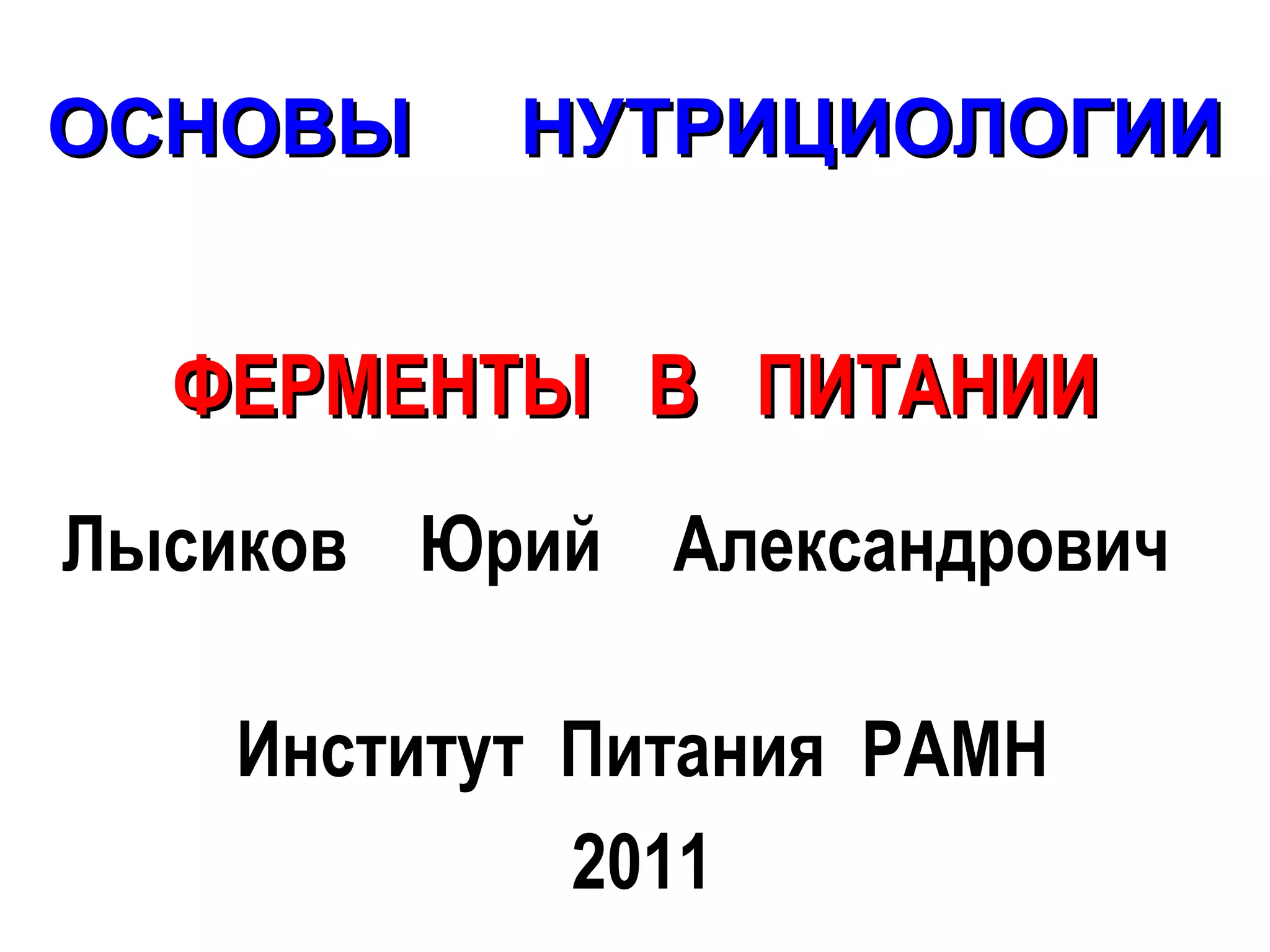 Документ освещает основы нутрициологии, акцентируя внимание на роли ферментов как биологических катализаторов и их значении в организме человека. Описываются основные виды ферментов, их функции, необходимость коферментов и применение энзимотерапии при различных патологических состояниях, включая недостаточность пищеварительных функций. Также упоминаются разновидности ферментных препаратов и их влияние на процессы пищеварения и здоровье.