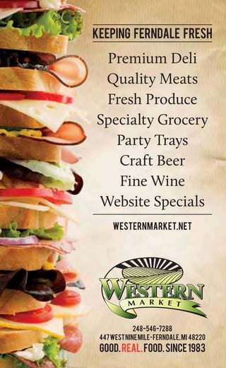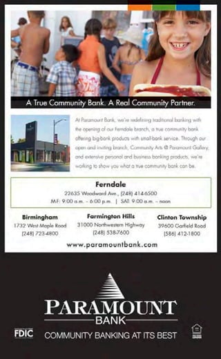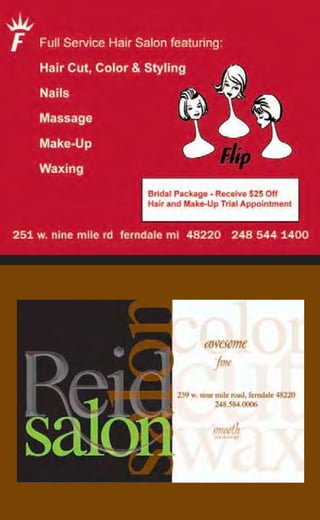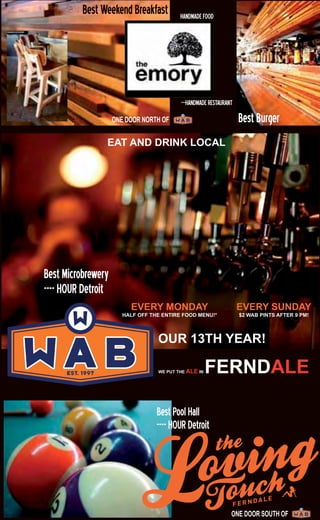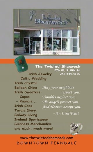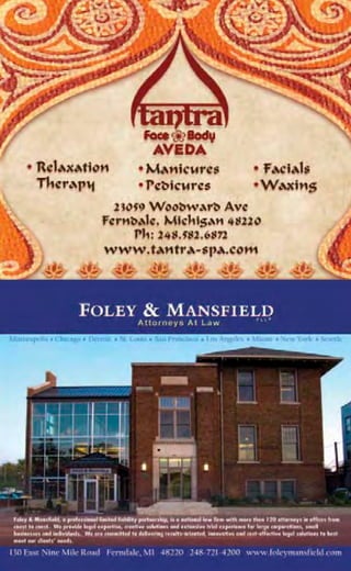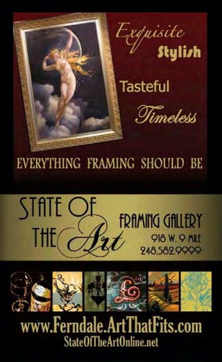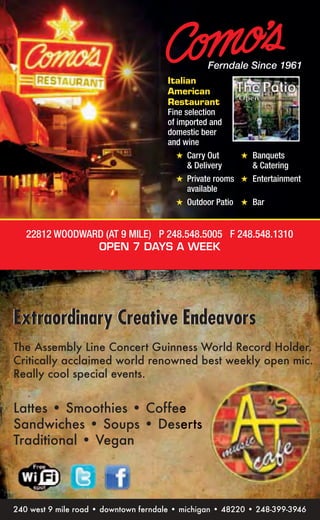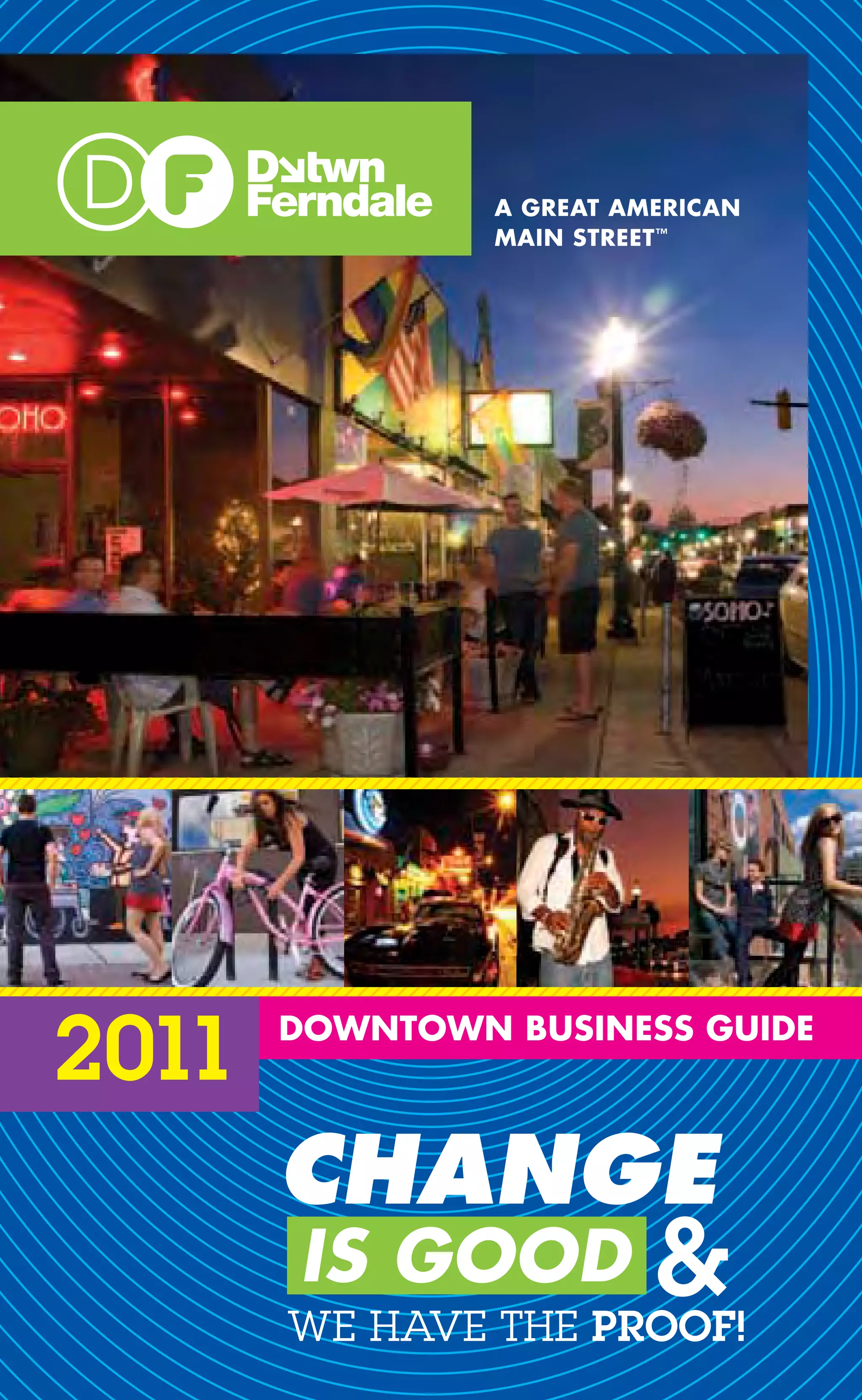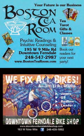 This document provides an overview of businesses and organizations in Downtown Ferndale, Michigan. It highlights that Downtown Ferndale has undergone positive changes in recent years, winning awards for its revitalization efforts. The document contains listings of various businesses categorized by type, such as art, automotive, dining, fashion, and professional services. It also profiles several community and civic organizations that are active in Downtown Ferndale.