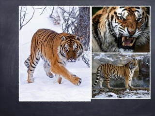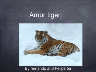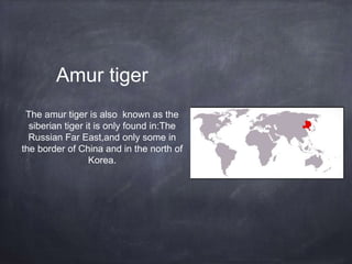 The Amur tiger, also known as the Siberian tiger, is an endangered species found primarily in the Russian Far East and the border regions of China and North Korea. They are becoming extinct due to poaching for clothing and habitat loss from human development like housing and roads. Conservation efforts aim to protect the Amur tiger's habitat from illegal logging and development to help save the species.