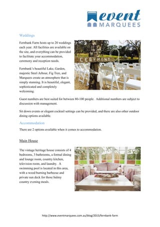 Fernbank Farm is a prestigious wedding and reception venue located in the Yarramalong Valley, New South Wales, just north of Sydney. The venue offers two beautifully restored homesteads on 25 acres, accommodating up to 100 guests for events and providing elegant wedding setups, alongside accommodation options like the vintage heritage house and a fully renovated cottage. Additionally, Fernbank features Santosa Clydesdales for horse-drawn carriage rides, enhancing the overall romantic experience for weddings.