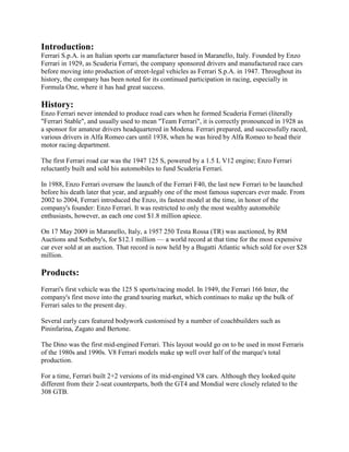 Ferrari is an Italian sports car manufacturer founded in 1929 by Enzo Ferrari. [1] It is known for its continued participation in racing, especially in Formula One. [2] Throughout its history, Ferrari has produced a variety of iconic sports cars like the F40 and Enzo that have become some of the most famous supercars ever made. [3] Ferrari's strategic planning process involves formulating a strategic intent, mission statement, vision, and goals and objectives to guide the company's long-term strategic direction.