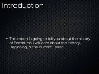 Enzo Ferrari founded Ferrari in 1929 after working for Alfa Romeo as a race car driver and manager. He started as a race team for Alfa Romeo called Scuderia Ferrari and later started his own car company. Ferrari is now owned by Fiat but is known for producing high performance exotic sports cars. Some of Ferrari's most famous models include the F40, F50, Enzo and current top seller the F430. Today Ferrari remains the leading exotic sports car brand, outselling Lamborghini.