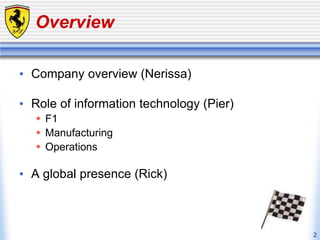 Ferrari is a manufacturer of high-performance sports cars and racing cars located in Maranello, Italy. Information technology plays a key role in Ferrari's business, especially their Formula 1 racing division. Ferrari uses IT for telemetry to analyze car performance during races in real-time, as well as for design including reducing weight, improving power and aerodynamics. Key technology providers include PTC for CAD/CAM, Ricardo for engine simulation software, and AMD for their data center. Ferrari sells around 4,300 cars per year globally and has outsourced some engine development to Tata Consultancy Services.