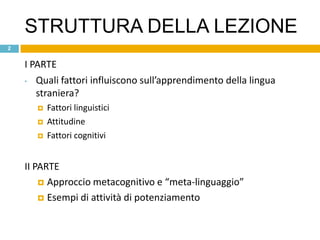 Il documento esplora i fattori che influenzano l'apprendimento delle lingue straniere, analizzando variabili cognitive, metacognitive e attitudinali. Vengono discusse le strategie efficaci per l'insegnamento e l'apprendimento, nonché le difficoltà di apprendimento associati alle lingue straniere. Infine, il testo presenta approcci didattici e leggi che supportano l'insegnamento linguistico, enfatizzando l'importanza della consapevolezza metacognitiva.