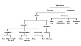 The document details the characteristics, properties, and classifications of ferrous and non-ferrous materials, particularly various types of steel and cast iron. It discusses the role of carbon and other alloying elements in affecting the mechanical properties of these materials, such as hardness, strength, and weldability. Additionally, it highlights specific applications for different steel classifications, including low carbon, medium carbon, high carbon, low alloy, and high alloy steels, along with different types of cast iron.