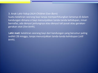 Dokumen ini menjelaskan konsep fertilitas dan fekunditas, perbedaan antara jumlah kelahiran hidup dan lahir mati, serta metode ukuran fertilitas seperti CBR, GFR, ASFR, dan TFR. Selain itu, dibahas juga perhitungan ukuran reproduksi seperti GRR dan NRR yang menunjukkan potensi penggantian generasi dalam suatu populasi. Terdapat juga kendala dalam pengukuran fertilitas yang dihadapi dalam penelitian ini.