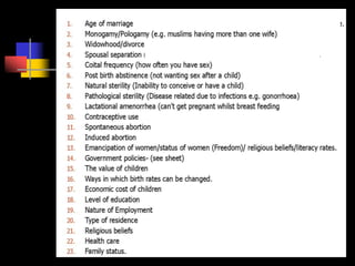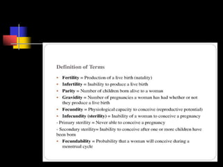 Factors that affect fertility include age at marriage, duration of married life, education levels, economic status, religion, and use of family planning. The document then discusses various metrics used to measure fertility, including the crude birth rate, general fertility rate, age-specific fertility rate, total fertility rate, and gross reproductive rate.