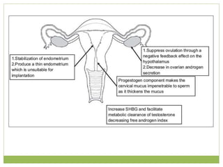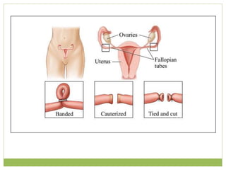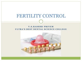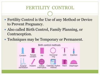 This document discusses various methods of fertility control, including natural methods like the rhythm method, barrier methods using condoms, spermicides, and IUDs. It also covers hormonal contraception using oral contraceptive pills, implants, and sterilization surgeries like tubectomy and vasectomy. The main mechanisms, advantages, and disadvantages of each method are described. Permanent sterilization involves surgical procedures to cut and tie off the fallopian tubes or vas deferens.